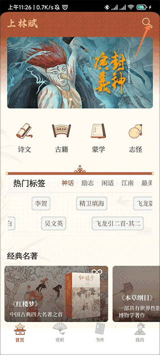 我们先进入上林赋app中,在主页的右上角有一个搜索按键,我们点击一下进入搜索界面。