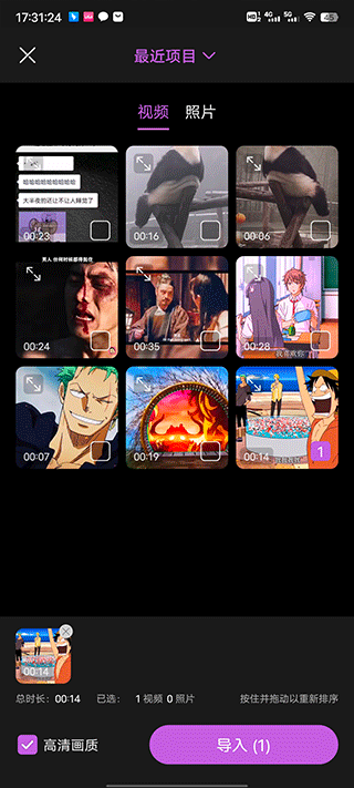2、选择你要剪辑的视频,可以多选,长按排序进行编辑,然后点击右下角的【导入】按钮