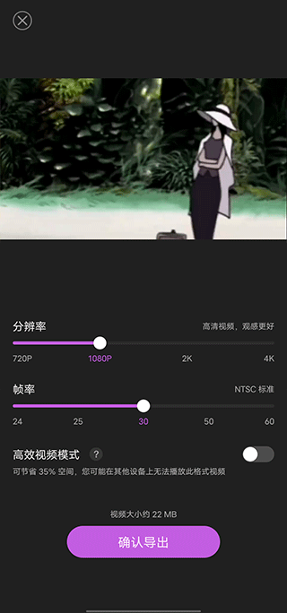 4、编辑完成,点击右上角【导出】按钮,自行选择【分辨率】和【帧率】,最后【确认】导出即可