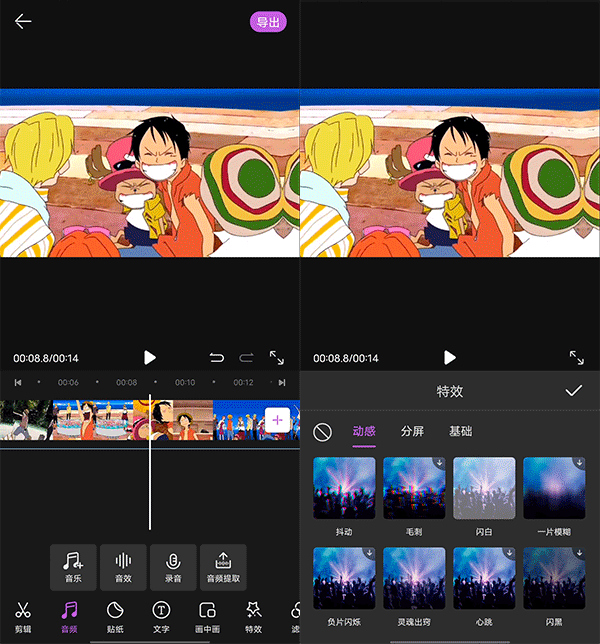 3、选择完成后,你可以在当前页面看到【剪辑】、【音频】、【贴纸】、【文字】、【特效】等功能,按照自己的想法和需求对视频添加配音或者特效