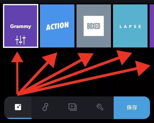 导入素材之后,你会看到下面的界面,Quik 里面一共拥有 22 个模板,大家可以根据自己的喜好,挨个儿进行尝试,每个都点击一下。我个人比较偏向前三个模板:Grammy、ACTION、BOXED。手机版 Quik 软件每个模板都有自己的转场特效,但是,这个转场特效并不能人为添加,它会根据你所选择的音乐、以及片段中的声音,自行随机添加转场特效,而且并不是每个片段中间都会添加特效,所以需要“碰运气”,但是可以肯定的是,两个素材如果分别只有一两秒,在这两个素材中间,是不会有特效的,手机版 Quik 软件不希望用太多选项令界面过度复杂。