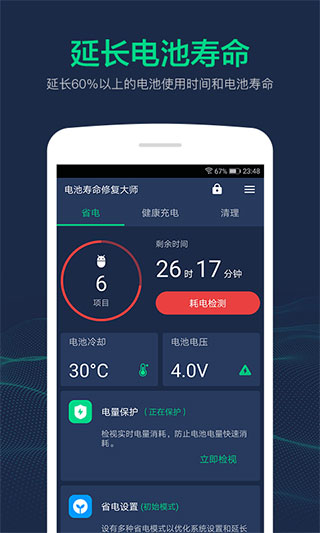 电池寿命修复大师是一款适用于android平台上的手机电池修复工具,旨在帮助用户更好的管理自己的手机电池。用户只需要坚持对电池进行检测和修复,无论你是用电源充电器还是充电宝充电,都能有效对安卓手机和平板用户延长60%以上的电池使用时间和电池寿命。该软件还能实时检测当前手机的充电状态,会自动执行专业的充电加速程序,使充电速度大大提升,节省了用户的充电时间并最大程度的延长了手机电池的使用寿命,是你手机贴身的电池管家。