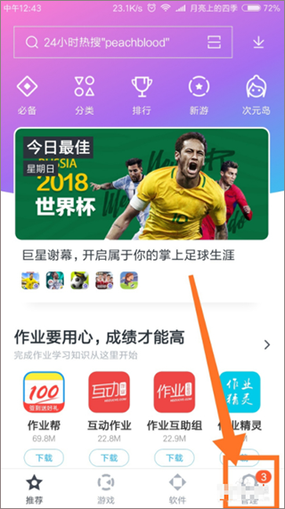 1、打开百度手机助手安卓版,进入首页页面后,点击右下角的管理进入。2、进入管理页面后,点击下右上角的账号头像进入。