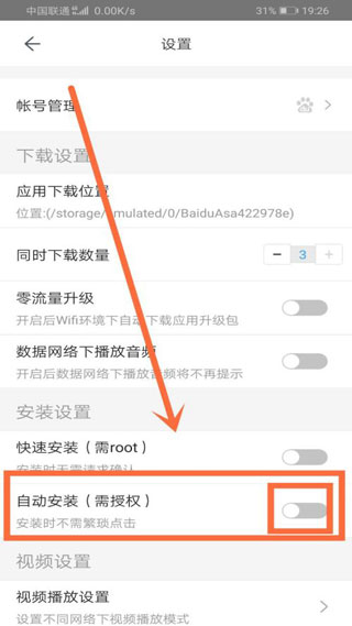 4、进入设置页面后,点击下自动安装后面的开启按钮。
