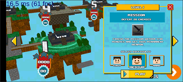 闯关模式:共有6个大关卡,每个关卡都有简单、普通、英雄三种难度可选。游戏一开始会给你一把武器,你需要清理所有敌人。击败敌人后可能会掉落补给箱(包括子弹和药品),合理利用这些资源能帮助你更好地完成任务。