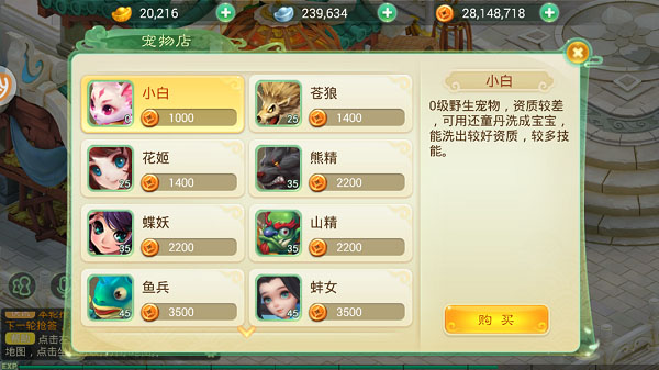 宠物的获取有两种方式:商店购买和战斗捕捉。玩家可前往女儿国宠物店老板(87,111)处购买自己喜爱的宠物,也可以查看宠物图鉴并前往相应的挂机场景进行战斗捕捉。