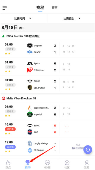 1、打开在本站下载的5e对战平台手机版,点击赛事,玩家可以官看各种时间段的赛事