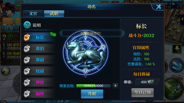 功名系统,功名分文官和武职两种,官位越高,战斗力加成越高。文官升级需要名望,名望的获取,玩家需要进行每日答题活动,答对的题目越多,获得的名望越多,名望达到升级要求就可以进行升级了。武职的升级需要武勋,武勋可以通过每日竞技场或者击杀敌国玩家获取,同样,武勋达到升级要求便可进行升级,官职系统每日还会提供将军俸禄。