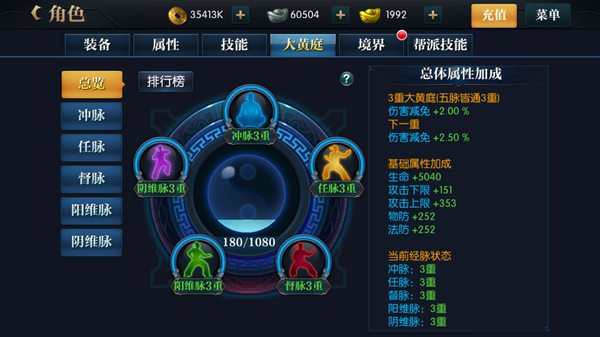 大黄庭系统,玩家在一定等级做完了指引任务后便可以开启大黄庭系统了,大黄庭系统需要玩家有足够的真气来激活穴位,每激活一个穴位都会为玩家带来一定的属性加成,大黄庭境界越高,加成越多。真气的获得也有副本,或者在商城直接购买真气丹。每个大穴位全部激活后需要一定数量的破障丹来打破屏障,5个大穴位全部激活后就可以达到下一重境界。