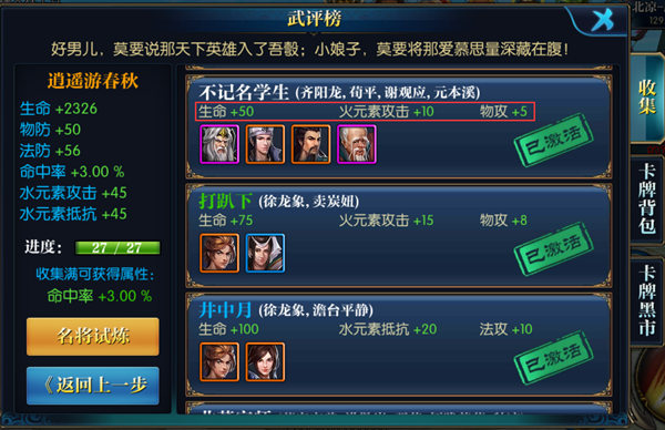 卡牌系统有很多种的不一样的方式,需要选择适合自己自身所选职业的契合属性进行激活,激活成功后不仅增加大量战斗力,还会使在实战中的表现更加强大。卡牌的获得也有多种不同的途径,最直接的就是在江湖系统中进行抽取,可以选择银子或者金子进行,银子抽取获得白绿蓝卡牌,金子抽取获得紫橙红卡牌。总而言之,努力去收集吧!