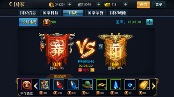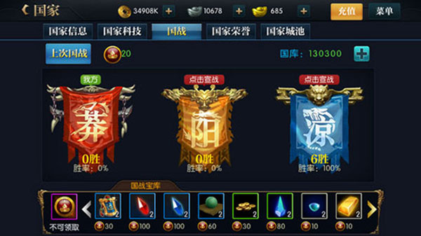 国家官员可以在每晚9点到次日18点进行敌对国宣战,宣战国和应战国之外,剩下的一个国家,可以选择帮助宣战国或者应战国(比如北莽宣战北凉,离阳可以选择帮助北莽进攻北凉或者选择帮助北凉防守北莽)