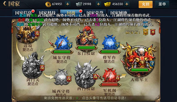 国战需要首先攻克剑门,才能进行接下来的战斗,剑门关的大将就在地图正中了,召集全国兄弟向它进攻吧!!