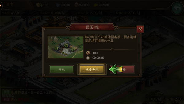 这是一款国战类的策略游戏,在游戏中我们可以培养武将,发展自己的军队。也可以进行PVP战斗,攻打对方的城池掠夺资源,是一款需要均衡发展的游戏,下面一起来学习一下如何玩吧。进入游戏之后首先需要做的就是发展自己的城池,首先就是建立自己的民居,民居可以生产预备役,预备役则是武将携带的士兵,也是最基础的兵,需要多的生产。
