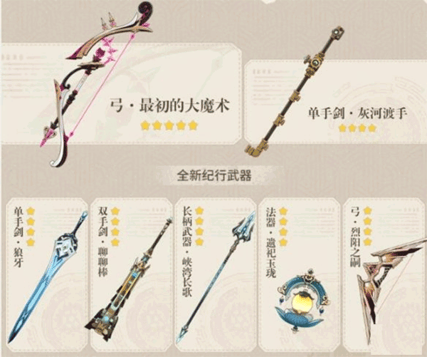 从本次纪行起,纪行宝匣将在原有五把4星武器的基础上,新增4星武器「单手剑·狼牙」「双手剑·聊聊棒」「法器·遗祀玉珑」「弓·烈阳之嗣」「长柄武器·峡湾长歌」。旅行者在珍珠纪行等级达到30级时,可在纪行宝匣内,选择领取十把武器中的任意一把。