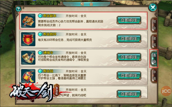 主界面中,点击“帮会”按钮,至“活动”选项选择“帮会副本”即可