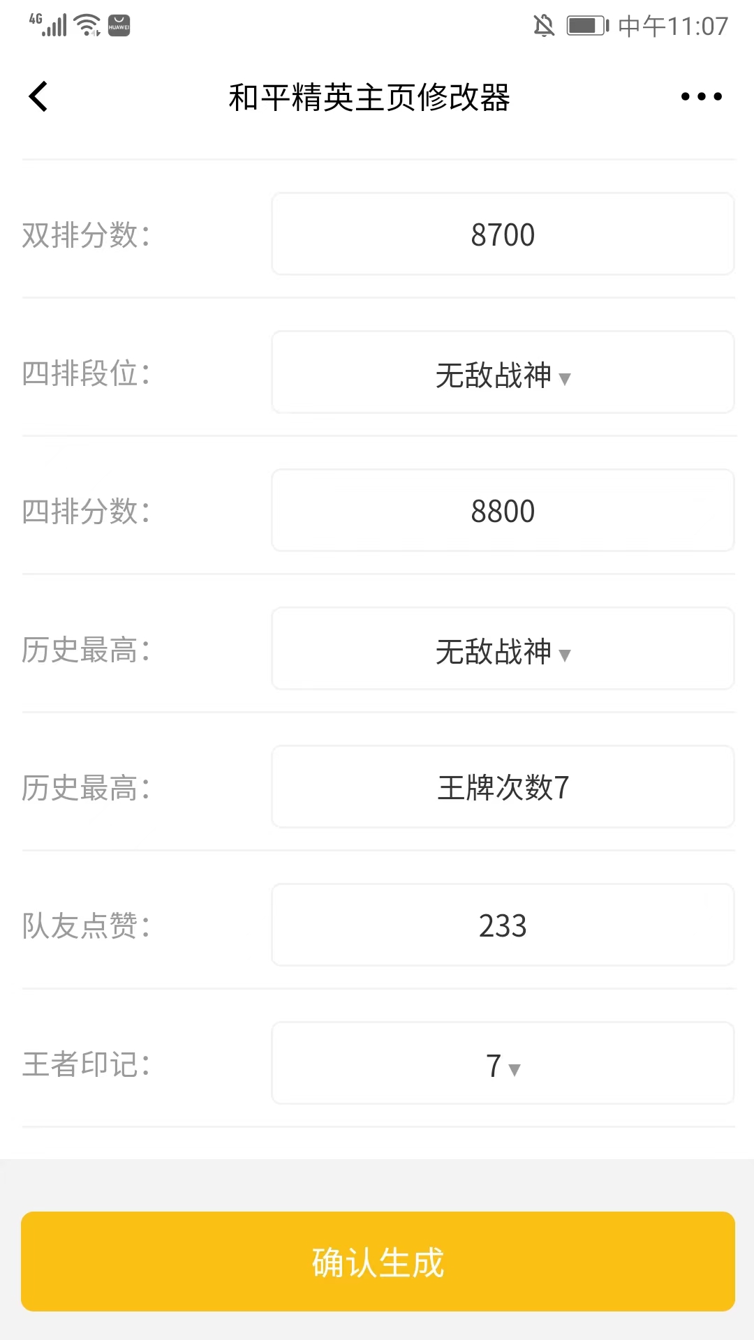 6、进入和平精英主页修改界面,选择编辑好头像、头像框、游戏名、分数、点赞数和王者印记等数据后,选择【确认生成】选项,