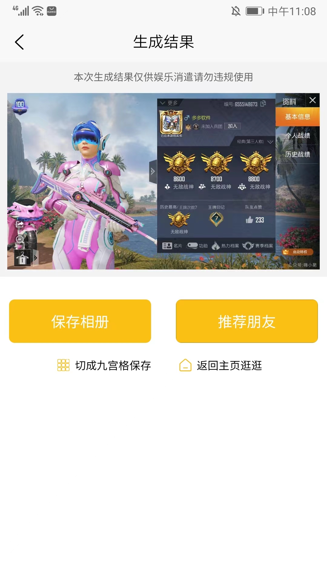 7、如图,可看到生成的效果图,还支持保存相册和分享给朋友,以上就是和平精英个人主页生成器免费版的用法了。