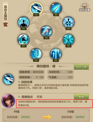 阿紫指点后,横剑疆场冷却时间增加6秒,同时降低目标的所有属性攻10%,持续15秒,最多可以叠加4层,也就是达到降低属性攻40%的效果,可以看出,这个削减程度还是相当可观的。作为一个基础攻击技能,有如此强大的辅助能力,在PVP中相当的好用。