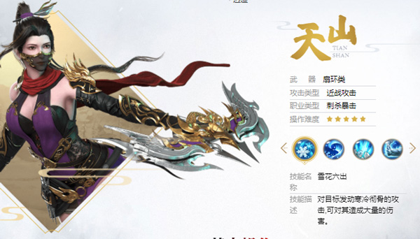 天山为近战职业,含有冰系能力,单体爆发强,拥有瞬移、隐身、封穴等能力,在PVP中十分优秀,较为注重操作和意识;