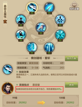慕容复指点后,横剑疆场可以对血量百分比超过自己的敌人增加40%的伤害。使用此指点需要注意自己的血量与目标的血量,要达成条件才能提高伤害,不过在打BOSS时,可以控制自己血量,使得慕容复指点一直生效。在各种战斗时始终控制自己血量低于对手,是比较困难的,需要多加实践。