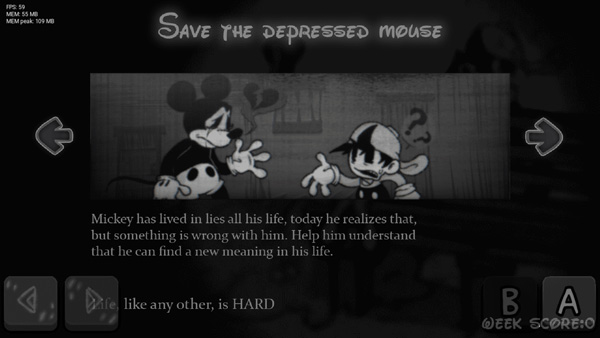 游戏有多个关卡和不同的剧情模式,适合喜欢节奏性音乐的朋友。新增的恶搞米老鼠模组让视觉体验更好,还有三阶段变身的BOSS设计,增加了游戏的紧张感和趣味性。特别是第三阶段,米老鼠拿着针筒攻击玩家,场面相当刺激。