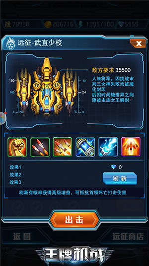 王牌机战冒险模式的特色即在与它丰富多样的敌机和怪物。只需舞动指尖享受爆破对手的快感,追求比基友们都要高的周榜排名,相信可以使一系列休闲玩家充分的感受到快节奏的弹幕对决,充实你所有的碎片时间。火力对决、无尽挑战、星际迷航、噩梦远征、巅峰对决等五大板块内容,囊括了远征系统、BOSS车轮战、GVG团战等类型丰富的战斗内容。