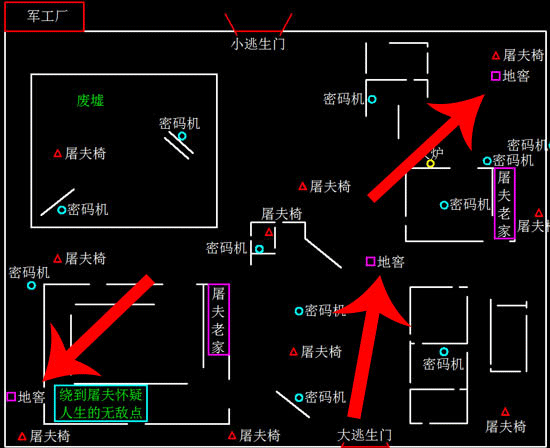 军工厂的地窖有两个分布在地图角落,一个在无敌点附近,一个正好在无敌点的对角线上,而第三个地窖位置恰巧在另外两个地窖对角线上的中点位置,小伙们在找地窖的位置可以依照这个思路去记忆地窖地图的位置。