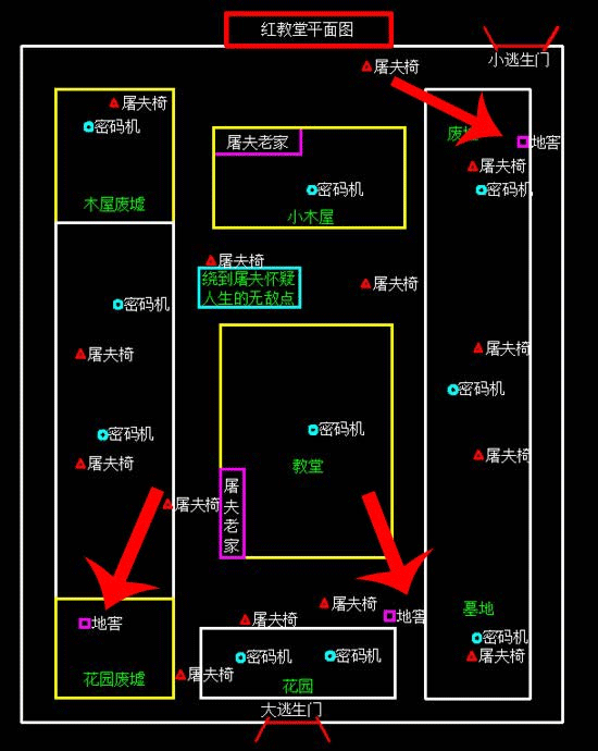 红教堂的地窖地图有两个分布在大门花园附近,大家在找地窖的时候最好能在来这边找,剩余一个大家可以沿着地图墓地位置直线跑过去找,但是要小心监管者的位置因为这段距离比较远。