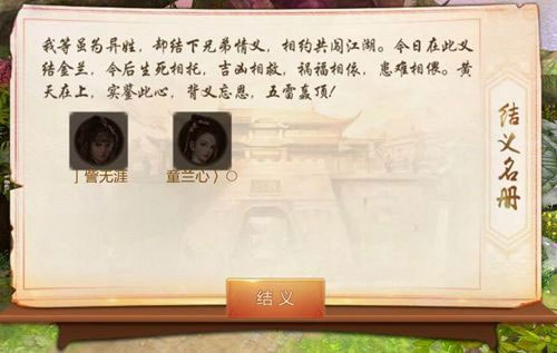 与结婚系统不同,《刀剑斗神传》中结义并非限定两个人,最多允许八人一起同结金兰,结义有四大好处。首先,结拜的兄弟在好友列表会显示特殊颜色,同时享有5%的打怪经验加成;其次,共享仇人名单,结义兄弟被其他玩家击杀后,结拜成员会自动收到一封名为“报仇雪恨”的邮件,告知仇人的情况。
