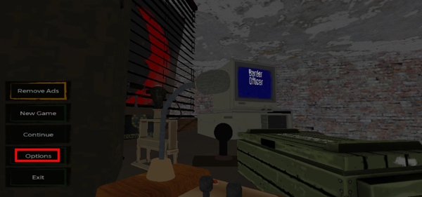 1、首先打开边境检察官游戏,进入到主页面时,点击倒数第二行的设置即可,称之为:optinos,也是这个游戏的设置选项。