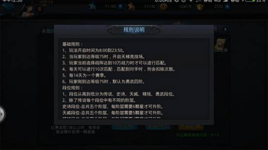 3、段位:段位从低到高分为勇武、精锐、天威、史诗、传说段位。其中天威和史诗段位为五个阶层,勇武和精锐段位为四个阶层。传说段位没有阶层,只有积分,默认为1000积分。