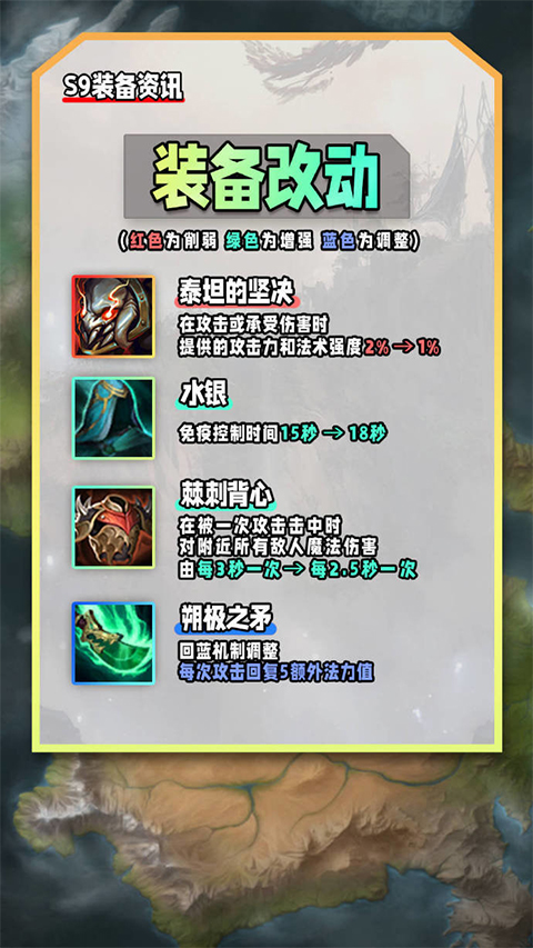 云顶之弈s9赛季符文大陆即将全新上线,此次新赛季除了新增了传说之地和城邦玩法两大机制外,还有全新的装备改动,既有此前赛季装备的回归,也有新装备的加入,许多玩家都想了解新赛季的装备情况,本期内容就为大家带来云顶之弈s9装备介绍详细表以及新增装备介绍。