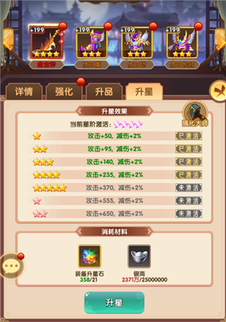 除了强化外,装备还可以通过升品来提升品质,用图纸和符文升级装备颜色,都会提升装备属性。装备除了以上的强化,升品还有升星也是对属性提升巨大的。