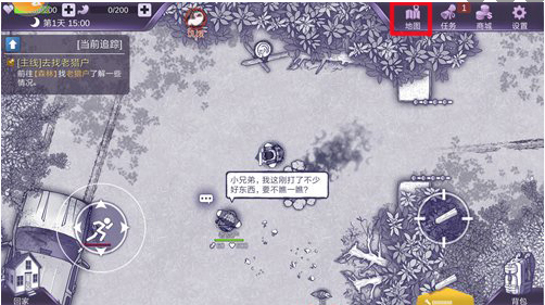 2、到森林之后,我们可以与老猎人对话接取主线任务,当然他让我们去加油站,大家暂时都不要去,因为打不过那里的丧尸,我们要先做好前期的准备才行。点击右上角的地图,打开地图可以看到森林地区的地图。
