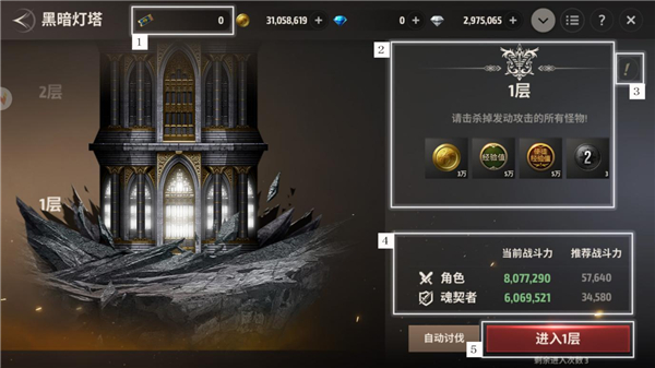 通关当前层数后可挑战下一层,塔内可获得提升装备属性的魔法石。