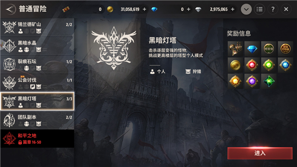 通过[菜单] – [普通冒险] – [黑暗灯塔]界面可进入黑暗灯塔。