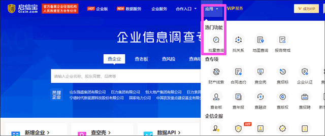 1、首先,打开启信宝官网,在官网首页的应用一栏中找到并点击热门功能中的“批量查询”选项;