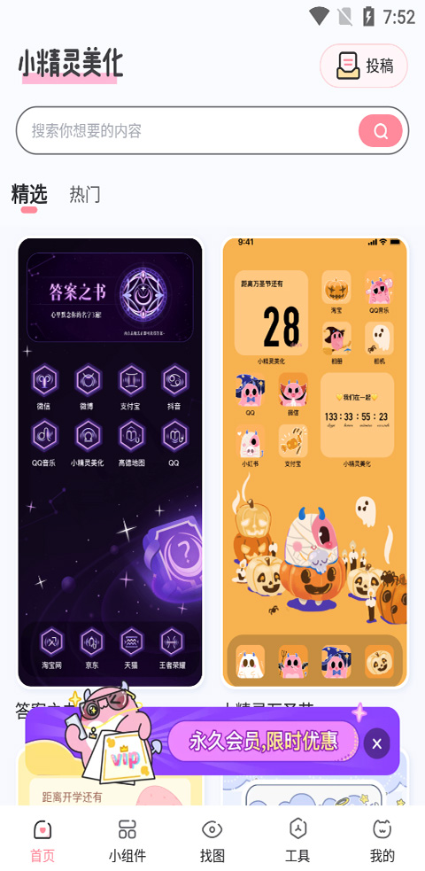用户打开并登录小精灵美化app后,进入首页就可以选择自己认为好看的手机桌面样式进行一键替换,也可以在顶部搜索框中搜索自己想要的手机桌面样式
