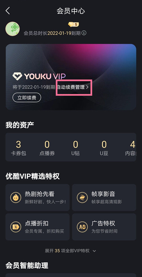1、从优酷视频app中点击我的界面,进入会员中心找到自动续费管理。