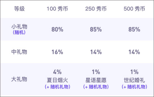 购买礼物送出后,送出礼物者账户内扣除秀币;收到礼物者账户内增加秀钻,获得秀钻的价值为礼物秀币的40%(幸运礼物为20%)。