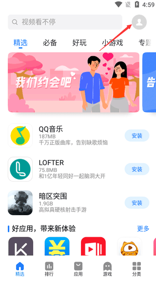 2、可以看到有精选、排行、应用、游戏、分类等栏目,在精选这里,用户可以下载由平台精心挑选的软件和游戏;