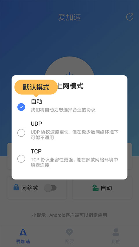 5、首页可设置上网模式,上网模式包括:自动、UDP协议、TCP协议。推荐设置自动模式(默认模式)。