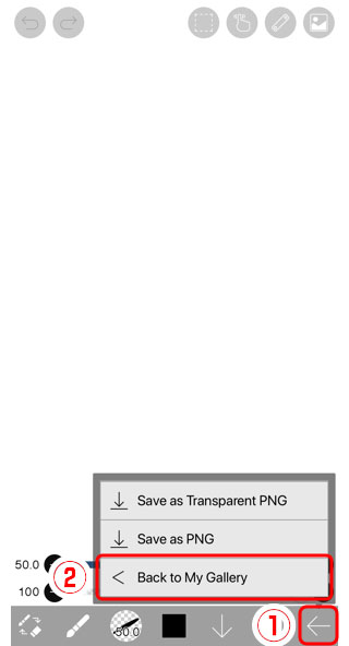 4、画布屏幕如下图。这是您将在其中创建图稿的主屏幕。要停止绘图,请点按①后退按钮并点击②回到我的画廊。这将带您回到"我的库"屏幕。