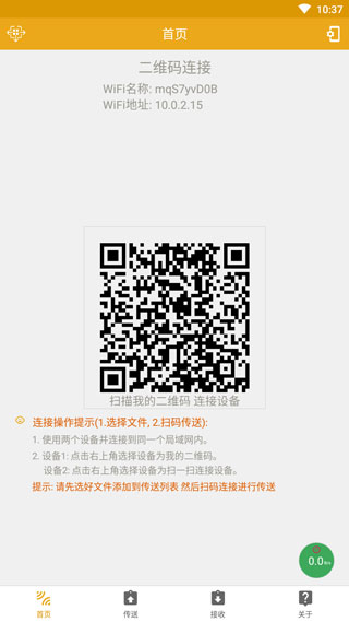 1、WiFi扫码传送,移动设备间通过扫码二维码的方式进行连接,连接成功后可以在设备间进行发送或接收文件2、WiFi开启FTP服务传送,移动设备在FTP功能界面开启FTP服务功能后,可以在其他设备上输入相应地址直接访问SD卡上的任何文件