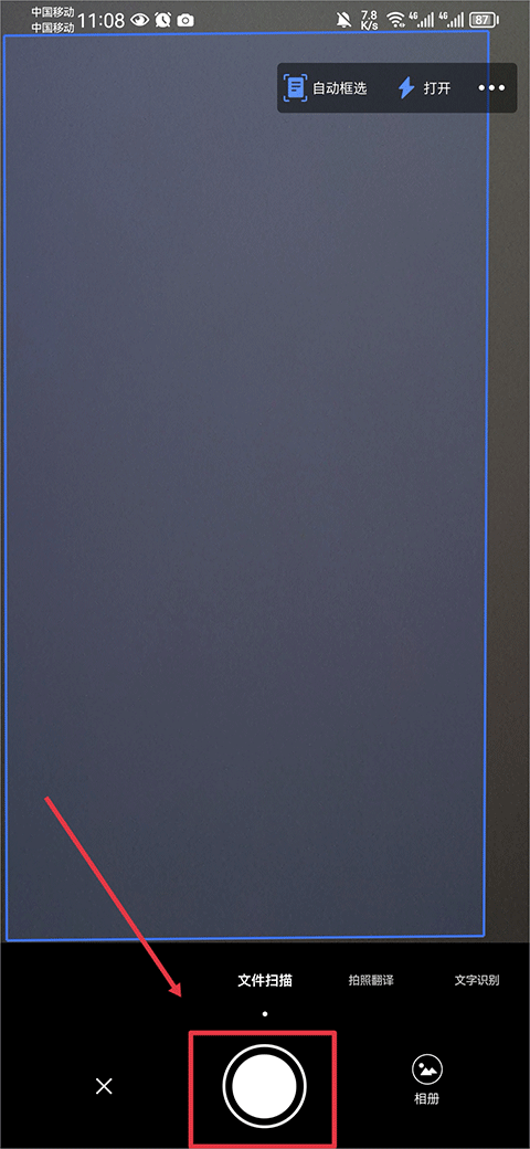 2、进入后将相机对准文件后,点击白色拍照按钮