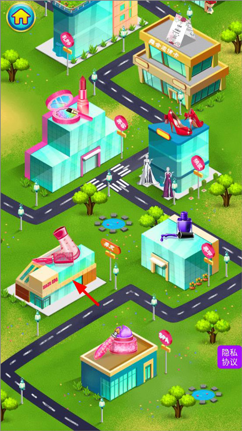 2、进入游戏页面后,玩家可看到游戏有不同的场景,包括护肤、美发、化妆、换装等,玩家可随意开始一种玩法也可从SPA开始;