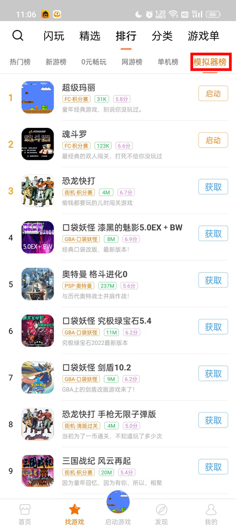 2、可以看到罗列了网游榜、单机榜、模拟器榜;