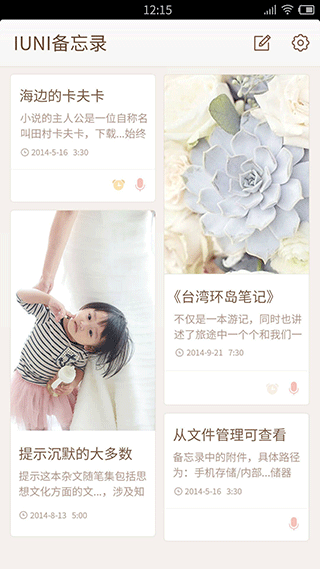 IUNI备忘录app是一款由深圳市艾优尼科技有限公司开发的非常好用的系统备忘录工具,由曾主导参与腾讯旗下TITA ROM等多个移动互联网产品的技术骨干开发,具有瀑布流涉及、便捷记录、精美排版以及备忘分享四大功能特点,支持图片的插入,支持分享到其他应用,支持首行缩进等功能,让用户能够随时随地记录重要事宜,让记事、备忘更轻松,满足你所有的记录需求,还可以直接设置日历提醒,生成长图分享等等。