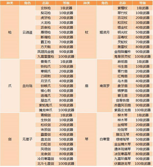 武器分为:枪、爪、剑、杖、扇、琴6种,非适用角色不可穿戴。