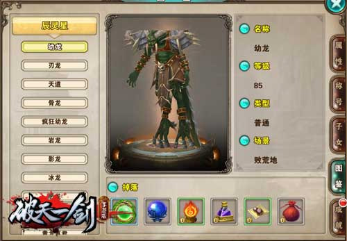 玩家自辰灵山庄出来,便是一片蛮荒地败荒地区域,这里的敌人等级主要分布在85~90级之间,敌人以幼龙和刃龙为主。这两种怪没有什么特殊技能,以普通攻击为主,但玩家也万万不可大意,辰灵星上每一个怪的实力都不可小觑!